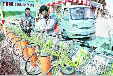 圖為黑河市區(qū)的管理人員將已檢修完畢的公共自行車運(yùn)至網(wǎng)點(diǎn)。本報(bào)記者張輝攝